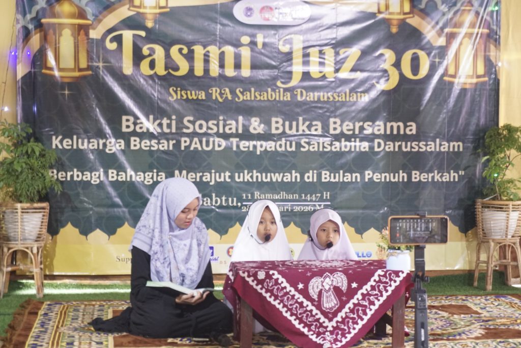 Dua anak berbaju putih telah duduk di depan pendopo dan melantunkan hafalan mereka. Suara kecil khas anak-anak terdengar berusaha mantap melafalkan ayat demi ayat. Di sisi kanan dan kiri, dua guru mengapit dengan tenang, menyimak bacaan sambil sesekali memberi isyarat lembut ketika ada bagian yang perlu diperbaiki.